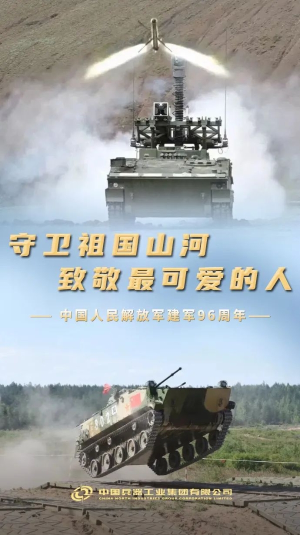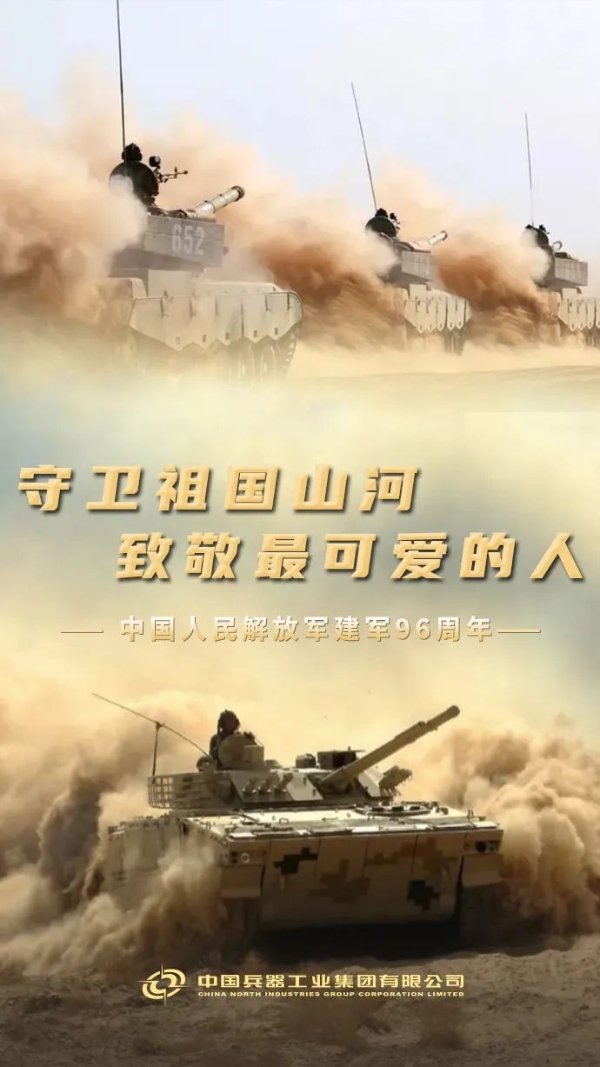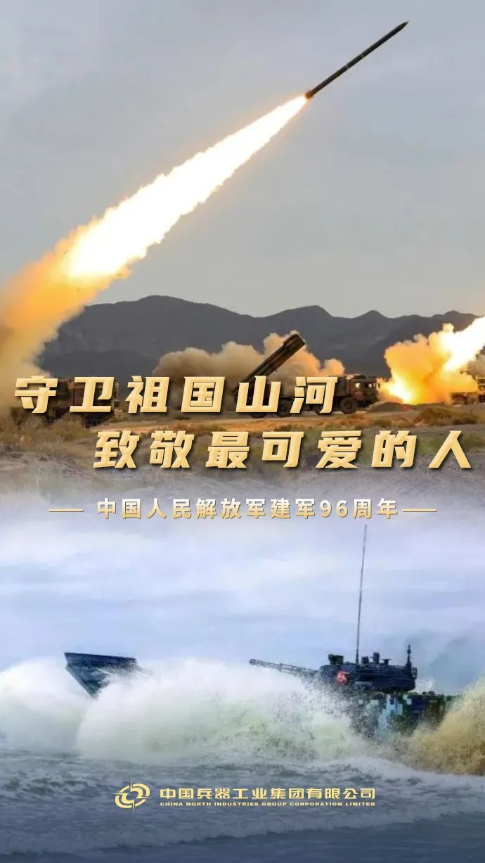 今天,“八一”! 中國人民解放軍建軍96周年 你為國保平安 我為你鑄利劍 使命催征,勇毅前行 兵器工業(yè)集團 將始終堅定履行好強軍首責(zé) 為把人民軍隊建設(shè)成為 世界一流軍隊 捍衛(wèi)國家主權(quán)、安全、發(fā)展利益 提供堅實的 技術(shù)裝備保障支撐 人民軍隊,生日快樂! |